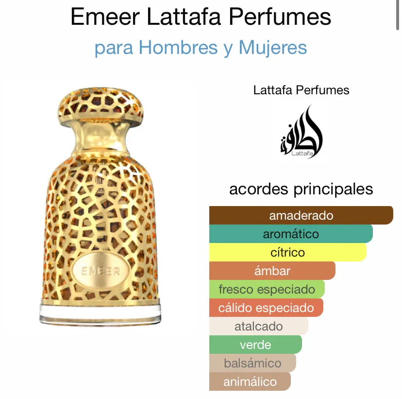 Lattafa Emeer es una fragancia unisex que te transportará a un mundo de lujo y elegancia. Con notas exóticas y duraderas, esta fragancia es perfecta para hombres y mujeres que buscan destacar su personalidad única. ¡Hazte con ella y déjate envolver por su encanto!